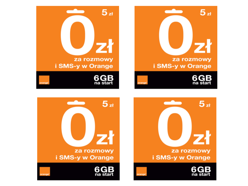 Sada čtyř startovacích karet sítě Orange Polska v balíčku Yes. Každá karta má předaktivovaný kredit 5 PLN. Ideální řešení pro osoby potřebující více čísel nebo k použití v zařízeních IoT, GSM alarmech, modemech.